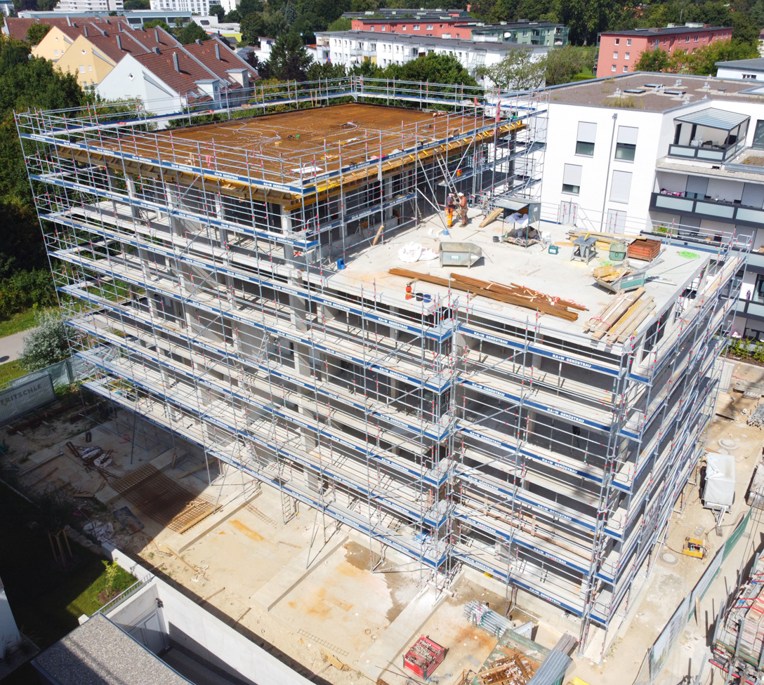 Protective scaffolding was needed during the construction of the building shell for an apartment complex with a timber-hybrid design. This scaffolding was to be erected section-by-section as the building work progressed. During this process, the Modular Access System AGS ensured not only rapid assembly and dismantling, but also two-part advancing side protection – both inside and out. An AGS platform stairtower also guaranteed rapid, safety-enhanced vertical access within the scaffolding. Even with working materials. A system-oriented solution.